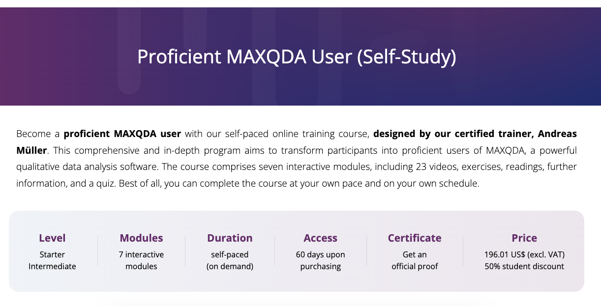 MAXQDA is easier to pick up than NVivo but still hard to use. For instructors, MAXQDA runs an intensive Professional Trainer Program. For students, there’s a paid self-directed Proficient MAXQDA User course to help learn the ropes outside of class for around $100 with student discount.